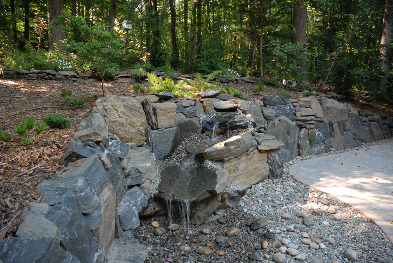 These customers were renovating their home and building an addition on a beautiful wooded property near Ridley Creek State Park. We designed and installed a new septic system and stormwater system to handle the runoff from the new addition and patio areas. We also excavated for the new addition, which was quite an undertaking as we had to bring in a blasting specialist to blast and break the Volkswagon- sized boulder typical of the area. We used the blasted/excavated rock to build a natural retaining wall around the new patio using selected pieces of rock to create a pond-less waterfall. The waterfall pond never needs refilling as it actually receives storm water runoff from the new addition downspouts and new patio, keeping it constantly full, with all of the overflow water piped to a newly installed storm water seepage pit.